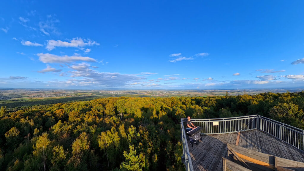 Der Winterstein ist kein einfacher Ort, um ein Klavier hinaufzutragen – besonders nicht, wenn es regnet und stürmt. Aber genau diese Elemente machten den Moment aus. Der Wind pfiff durch die Bäume, und auf dem Turm wehte er die Wolken über das Land, während Sonnenstrahlen immer wieder durchbrachen.